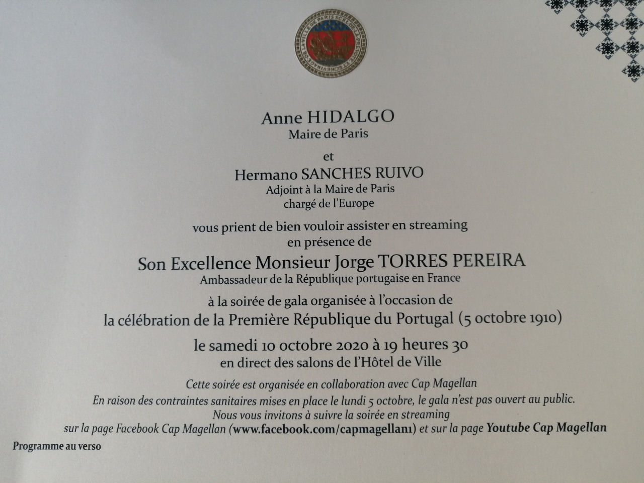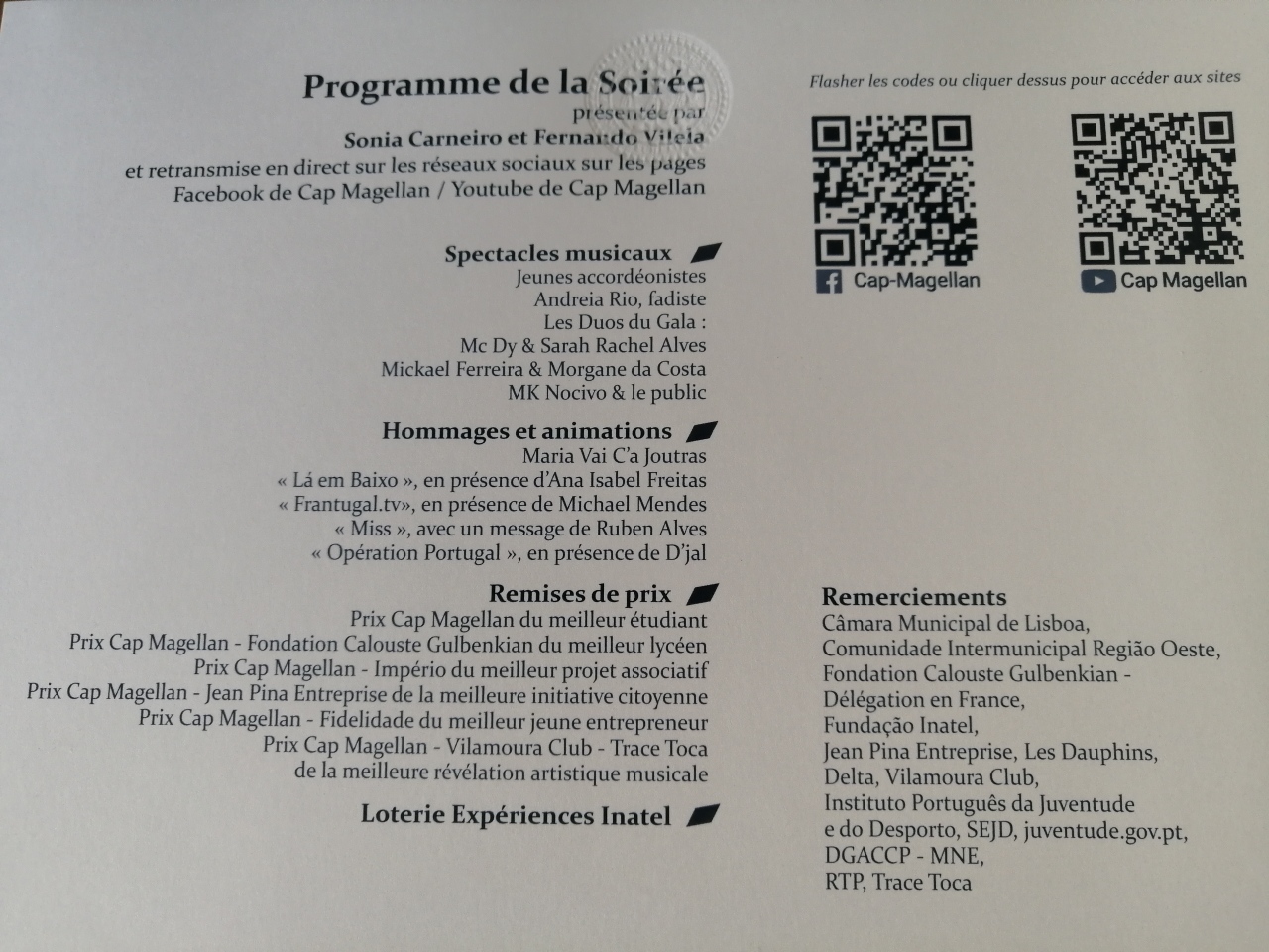 La Soirée de Gala de l’association Cap Magellan qui aura lieu ce samedi 10 octobre à la mairie de Paris. Pour des raisons de prévention sanitaire, il ne sera pas possible d’accueillir des invités dans la Salle des Fêtes de l’Hôtel de Ville. O Sol de Portugal est nominé pour le prix du meilleur projet associatif Antonia Estavel Co-présidente de l’association sera présente. Merci d’encourager l’association en regardant , la Soirée de Gala qui sera retransmise en direct en streaming sur la page Facebook Cap Magellan et sur la page Youtube Cap Magellan. Le public est ainsi invité à suivre en direct cette Soirée sans sortir de chez soi !